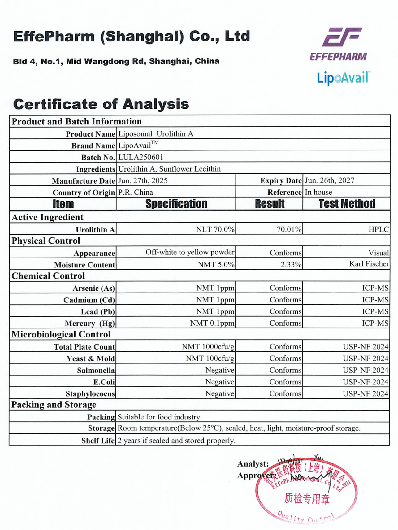 Unser AFEGA® Urolithin A wird in praktischen Kapseln zu je 250 mg angeboten – basierend auf einer liposomalen Hochkonzentrat-Formulierung mit 70 % Wirkstoffgehalt (LipoAvail™), gelöst in natürlichem Sonnenblumenlecithin.