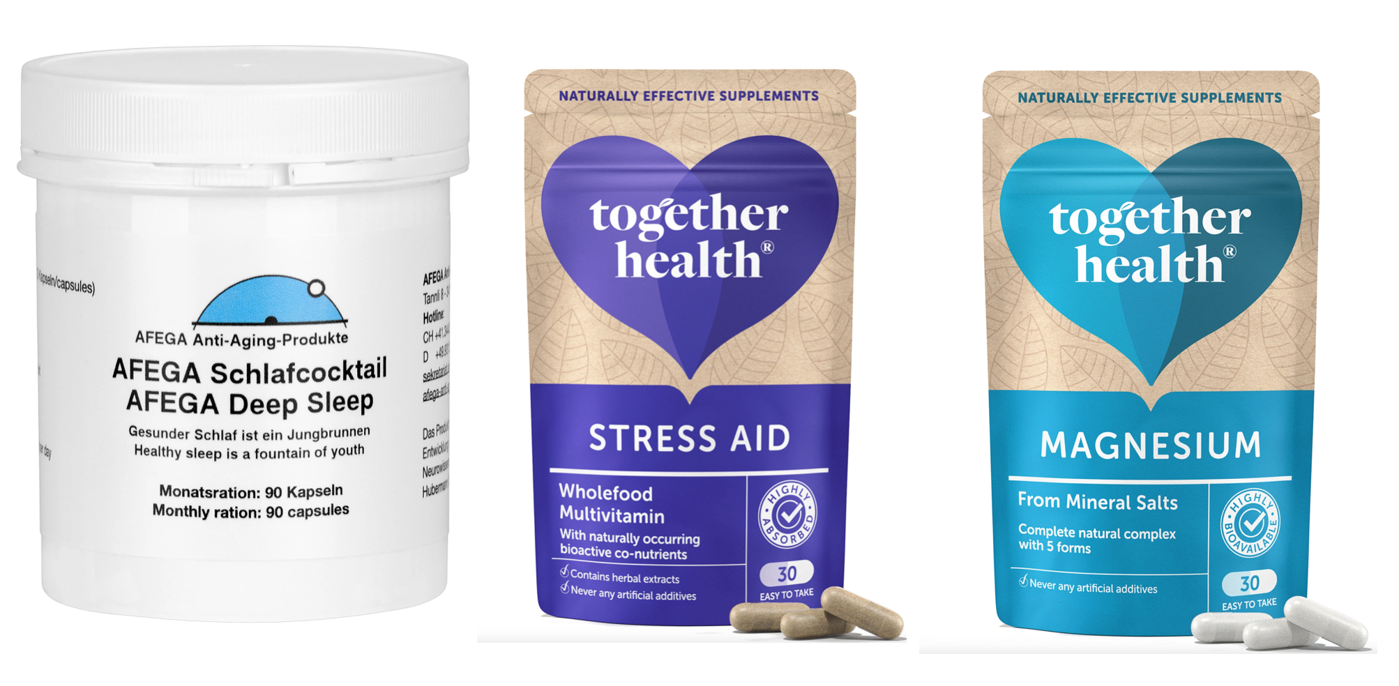 Hinweis zur „Monatsration“: Die Together-Health-Produkte enthalten jeweils 30 Kapseln (typisch: 1 pro Tag). Der Schlafcocktail ist als Abend-Baustein konzipiert. Je nach persönlichem Bedarf kann die Dauer leicht variieren.